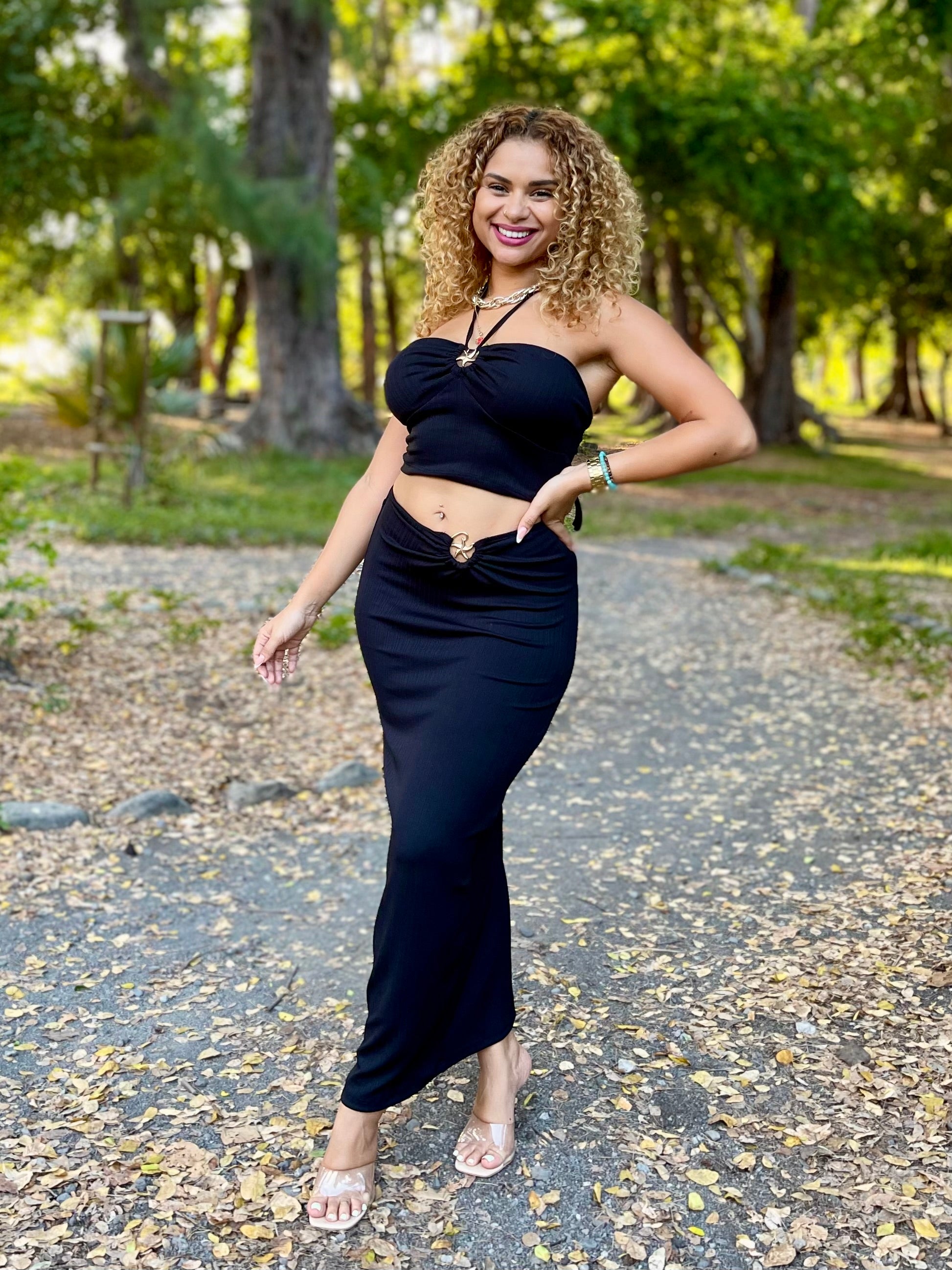 Un ensemble féminin et moderne composé d’un haut dos nu noué au cou et d’une jupe longue près du corps. Sa coupe met en valeur la silhouette et ses couleurs apportent une touche lumineuse et élégante.