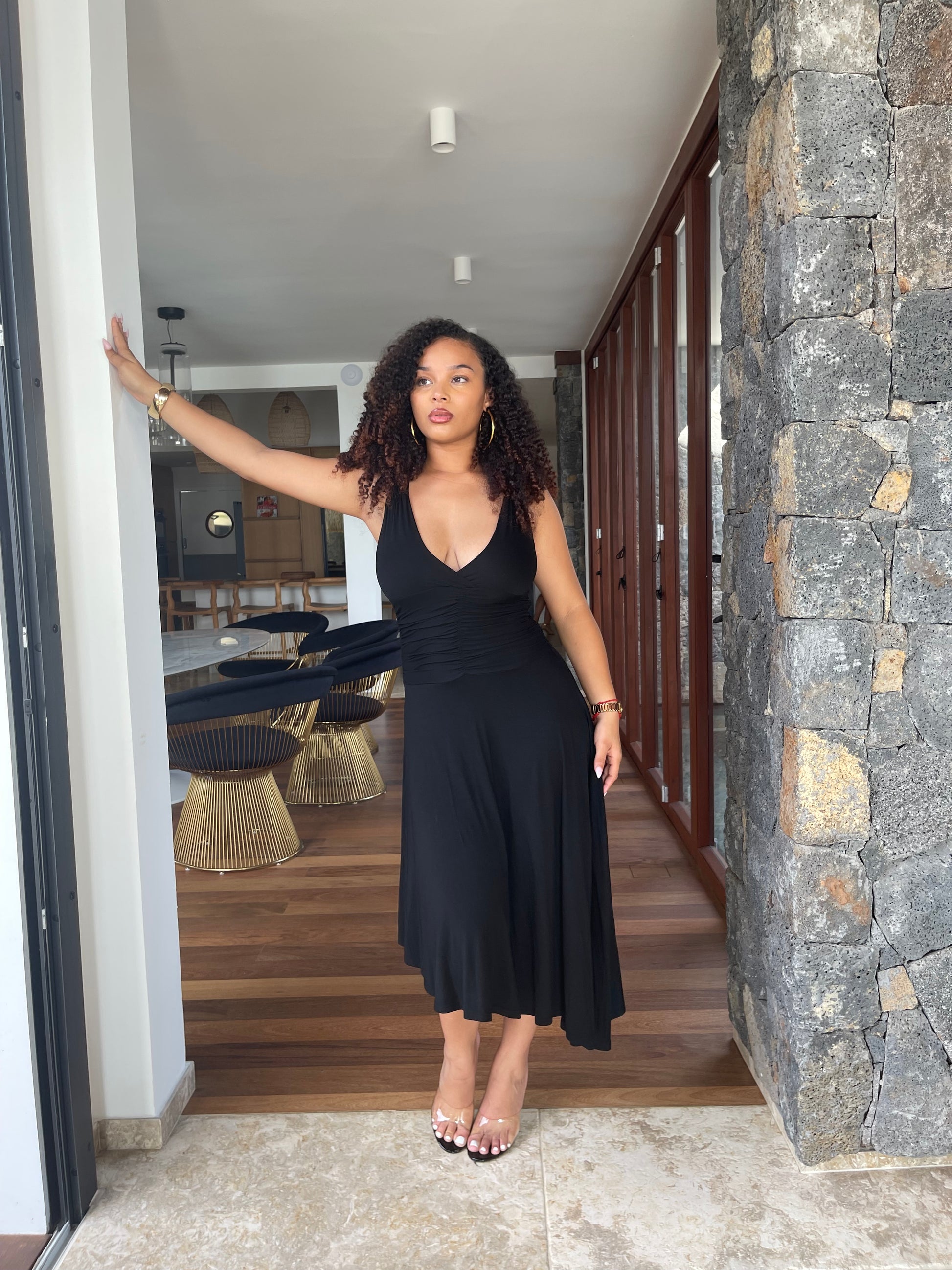 Robe mi longue fluide au décolleté en V, qui met en valeur la silhouette avec élégance. Taille froncée et coupe évasée assure un tombé léger et confortable. Intemporelle et féminine, elle se porte aussi bien en journée qu’en soirée.