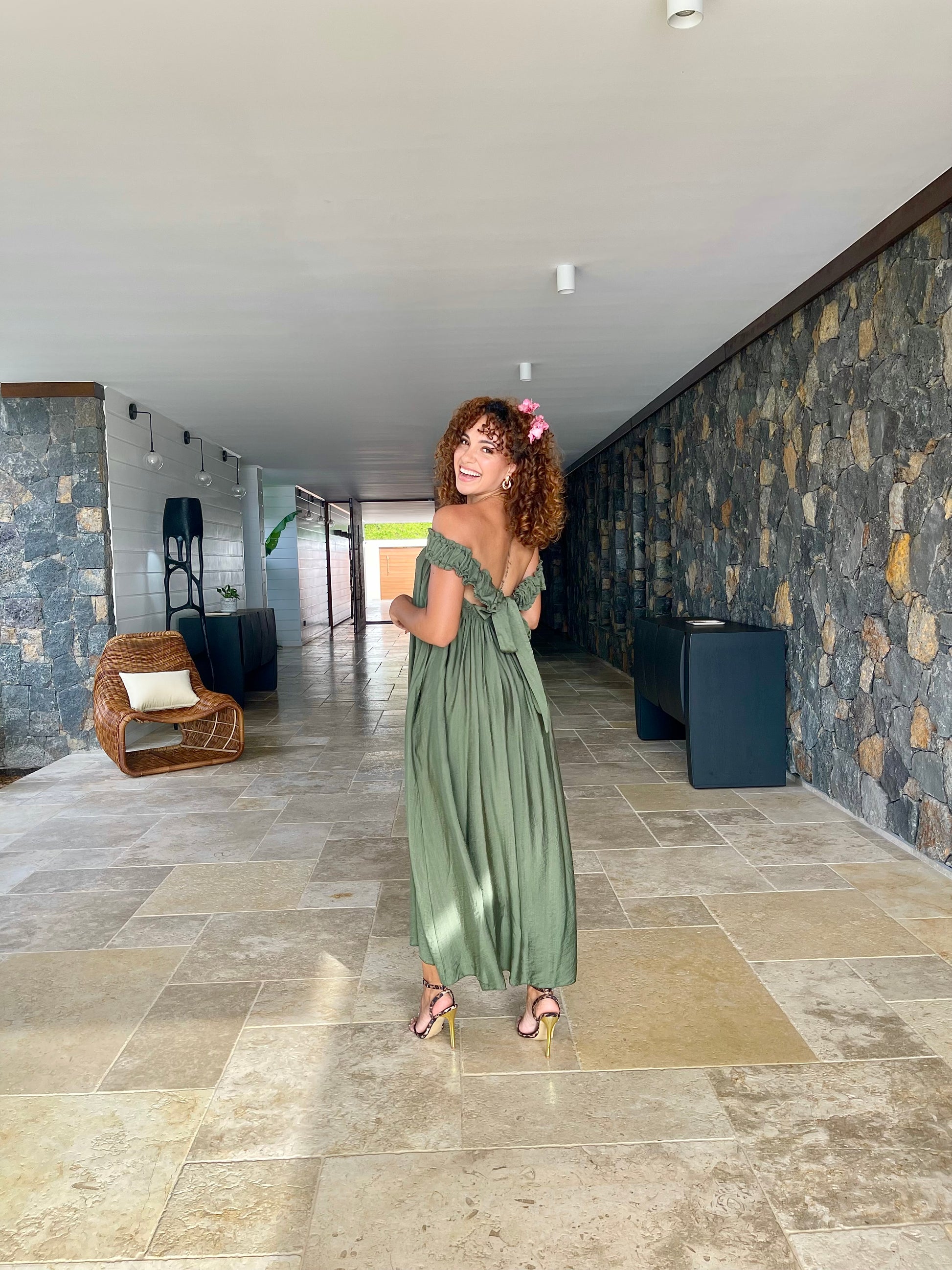 Robe fluide et légère à la coupe ample, col bardot et dos noué. Féminine et confortable