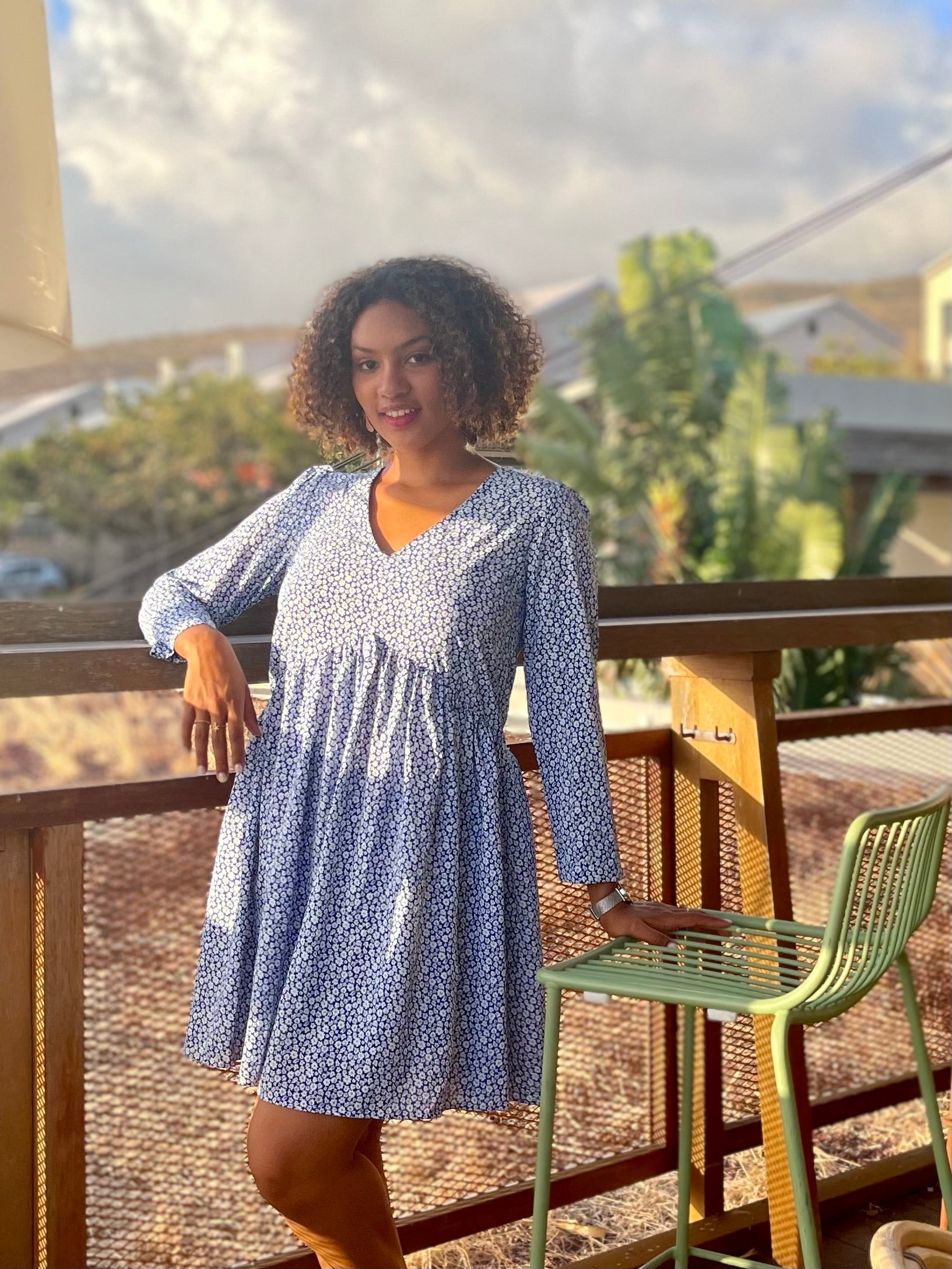 Robe fluide à manches longues, décolleté en V et imprimé fleuri bleu. Une pièce légère et féminine, parfaite au quotidien.